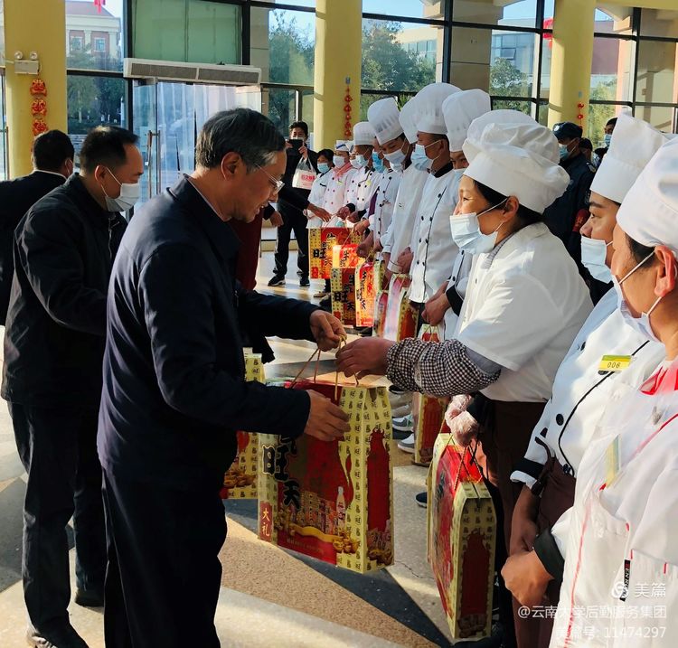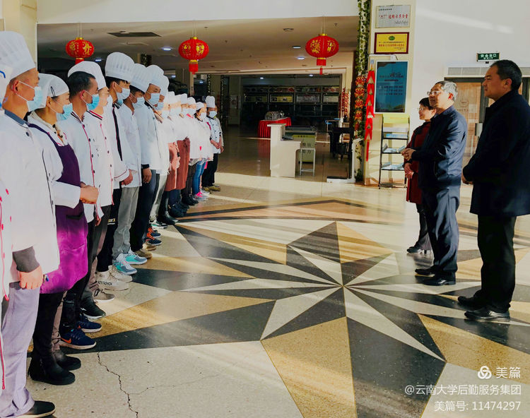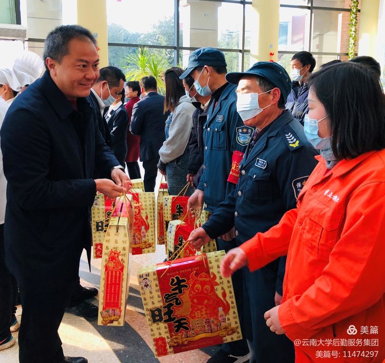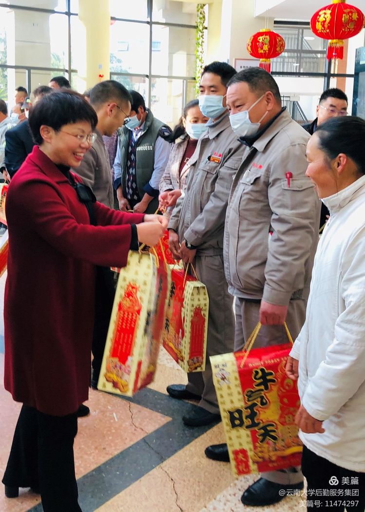 爆竹声声辞旧岁,金牛犇犇迎新年。2021年2月11日大年三十上午,云南大学党委林文勋书记、陈华仙副书记、段红云副校长一行深入呈贡校区馀味堂亲切看望慰问后勤集团职工。林书记发表热情洋溢的讲话,向春节坚守岗位的后勤员工拜年并致以新春的美好祝愿!充分肯定后勤集团一年来在新冠疫情防控、学校正常运转、师生后勤服务、后勤改革发展等方面取得的成绩!感谢大家为学校一流大学建设所做出的贡献!希望后勤集团员工在新的一年里,发扬拓荒牛、孺子牛、老黄牛精神,再接再厉,奋发有为,取得新的更大的成绩!后勤集团员工以热烈的掌声感谢学校领导的亲切关怀和肯定鼓励!学校领导新春佳节的到来,大家倍感亲切、深受鼓舞,信心十足、精神振奋,决心以更高的热情、更足的干劲、更实的作风全力投入学校后勤保障服务工作中,努力为学校一流大学建设做出云大后勤人应有的贡献!