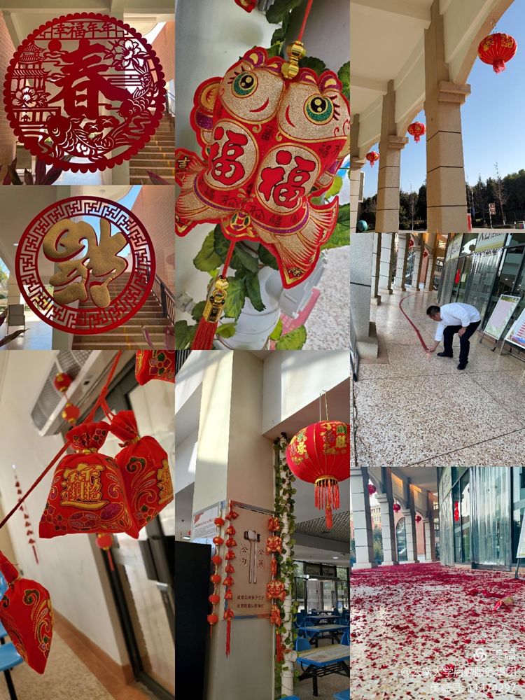 下午五点,学校留校师生除夕年夜饭在爆竹声中准点开餐。留校师生纷纷来到张灯结彩、喜庆欢乐、充满年味的学校餐厅,互致问候、举杯同庆,感恩祖国、感谢学校,畅叙友情、品尝美食,留校师生除夕年夜饭在欢快的新春音乐声中结束。