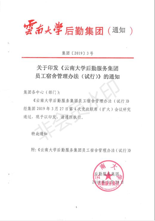 为切实解决集团编外员工住宿问题,加强员工宿舍管理,营造安全文明、卫生整洁环境,集团研究制定《云南大学后勤服务集团员工宿舍管理办法(试行)》。办法明确了集团编外员工宿舍的管理原则、管理范围、管理机构、管理职责及员工宿舍的申请条件、分配办法、收费标准、管理规定等内容。
