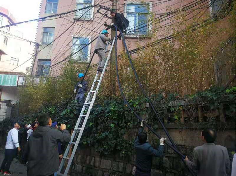 12:30,为确保按时供电,集团又调集水电工、保安、绿化工人、食堂员工、宾馆人员100多人协助供电局抢修队,上屋顶、爬电杆,拉放电缆、固定电缆,将一根根坚硬沉重的电缆摆放到位,供电局抢修人员分组搭接电缆、测试电缆。一切都在紧张有序地进行着......