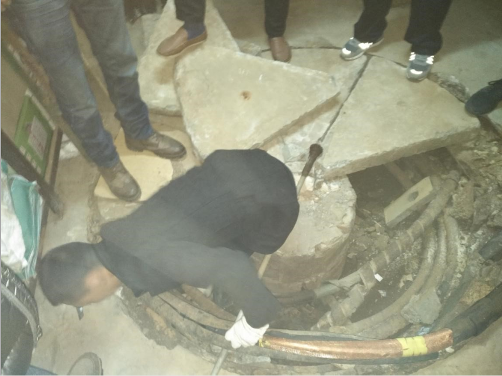22:30,技术员费尽力气打开电缆井、切断电缆、检测电缆。当发现故障点就在这一段,大家既欣喜又担忧,欣喜终于找到了故障,担忧的是在车水马龙的一二一大街如何抢修?抱着侥幸心理,希望故障点在人行道下的电缆接头处,抢修队迅及用电锤凿开人行道,打开电缆沟盖板,发现电缆接头完好无损。锯断电缆再测量,确认故障点在横跨大街路段。原先制定的方案宣告失败,大家焦急万分!