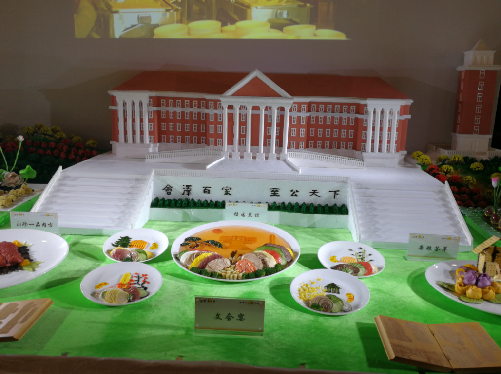 饮食中心的团体赛展台以云南大学呈贡校区主体建筑明远楼为背景,采用唐宋时期文人墨客以文会友的文会宴为主题,充分展示了一流大学的学风与餐饮文化相结合的学院餐饮。