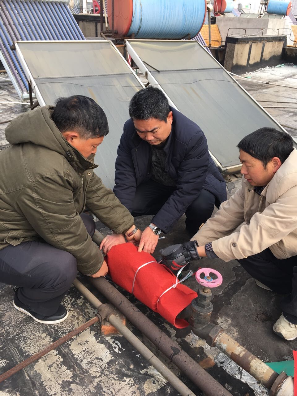 校本部住宅区物业服务部制定应急处置方案,有计划、有步骤开展应急处置工作;提前购买保温材料对373块水表进行防寒保温处理;对用电线路进行检修,防止电路故障;对太阳能进行保温排空处理、关闭阀门,防止管道破裂;积极做好植物、地被防霜冻工作;加大值班巡查力度,对存在问题做到及时处置,不留死角。
