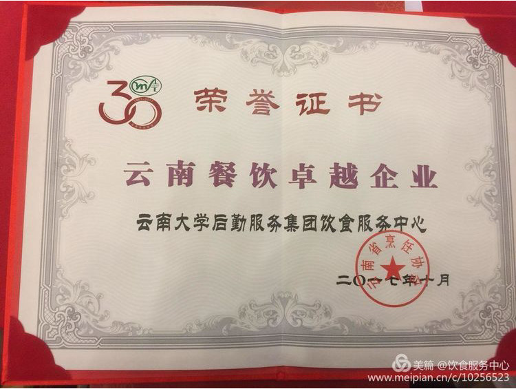 1月16日,云南省烹饪协会三十周年表彰大会暨五届二次理事会议在大喜时酒店隆重举行。云南大学后勤服务集团饮食服务中心喜获“云南餐饮卓越企业”称号,张顶兵、徐家彬被评为“云南餐饮杰出人物”,非绍贵、何宗应被评为“云南餐饮优秀人物”。