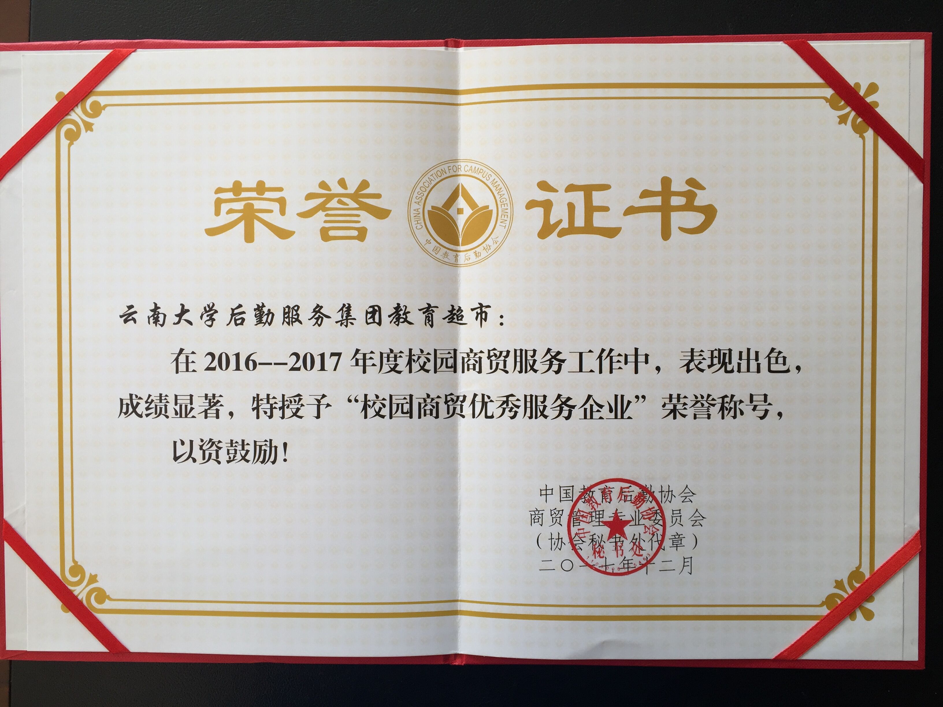 12月8日,“中国教育后勤协会商贸管理专业委员会(2017)年会暨校园零售创新发展论坛”在昆明召开,会上,教育超市被评为“校园商贸优秀服务企业”,成为全国获奖的三十六家优秀服务企业之一,同时也是云南省唯一一家获奖企业。