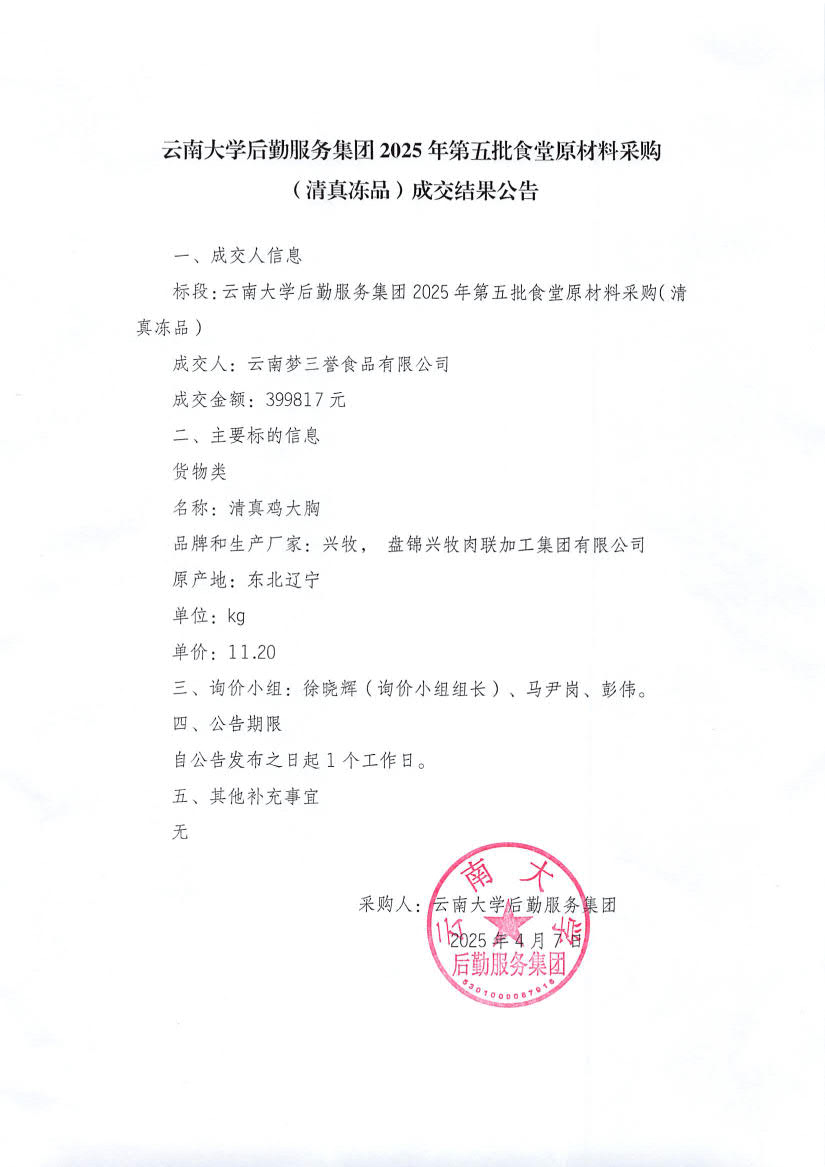 云南大学后勤服务集团2025年第五批食堂原材料采购(清真冻品)成交结果公告