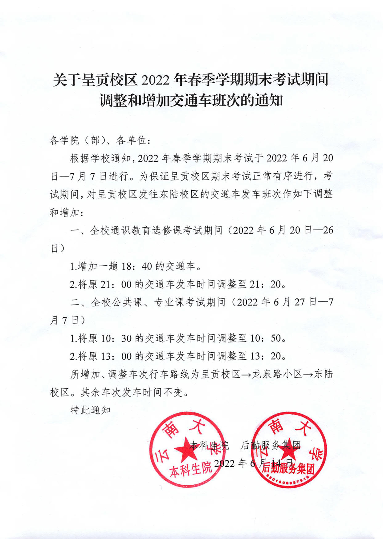 关于呈贡校区2022年春季学期期末考试期间调整和增加交通车班次的通知