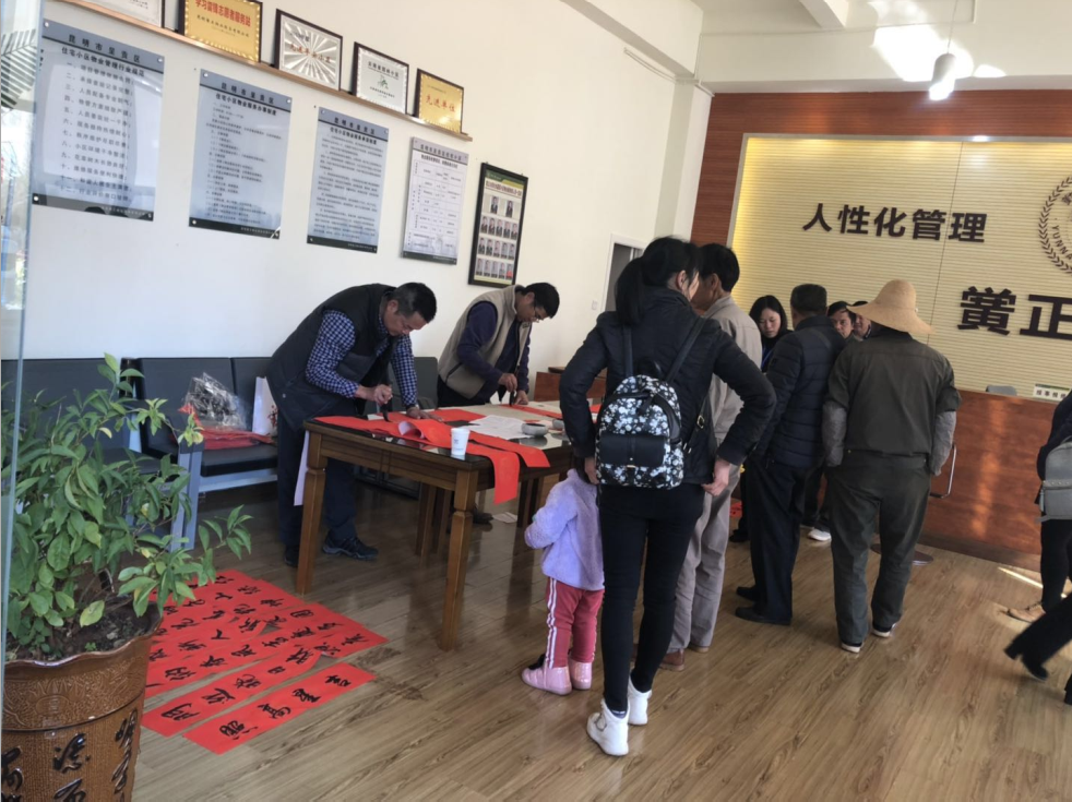天水嘉园服务部大厅内,来自书法协会的老师为业主写春联、送祝福,受到小区居民热情欢迎。书法家们挥毫泼墨、笔走龙蛇,行、隶、草等多种书体各显神韵,一会儿功夫,一幅幅写满祝福的春联跃然于红纸之上,一张张笑脸伴随笔墨飞扬,整个现场浓浓的年味扑面而来,把吉祥祝福送到家家户户。
