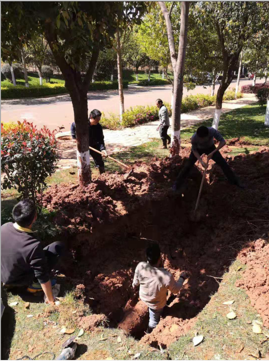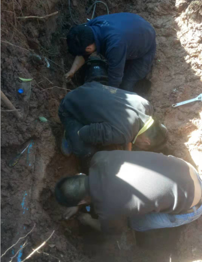 2月25日早晨,呈贡校区动力中心保障组接报,校区外环绿化带涌水。维修人员第一时间赶到现场,发现涌水处下方为学校主供水管,初步确定为爆管。中心立即启动抢修应急预案,经请示领导同意,立即开展止水作业。关闭外环路DN200管道阀门,涌水点水量减小,开始机械作业,漏水管道大部分被挖出后,发现系管道承接口处脱离造成跑水。维修人员继续进行人工挖掘清理,为方便作业,挖掘范围进一步扩大,清理工作量增加。与此同时,其他人员紧急调配维修所需用材料,等候参与抢修。在多个班组协同配合下,中午,用于维修的新水管及连接套管先后放入工作坑内。连接套管到位后,安装人员顶着寒风,在作业坑内不断调整姿势,克服重重困难保质保量地完成现场安装任务。在紧张作业七个多小时后,下午16点40分,现场开始进行收尾,维修人员克服连续工作带来的疲倦,先进行东侧承插口固定,一侧完成后,维修人员身体已非常疲劳;但是,破损的管道不容许他们有丝毫的懈怠,甚至来不及喝一口水就开始进行西侧承插口处理。受地形限制,处理底部时维修人员只能躺在泥泞中,身体夹在管道与工作坑的狭小空间内用双手一点一点加固。经过连续奋战,动力员工于17时完成全部维修工作,DN200管道因维修关闭的阀门全部打开,管线运行平稳,恢复正常供水。此时,抢修人员已浑身泥泞,衣服湿透。