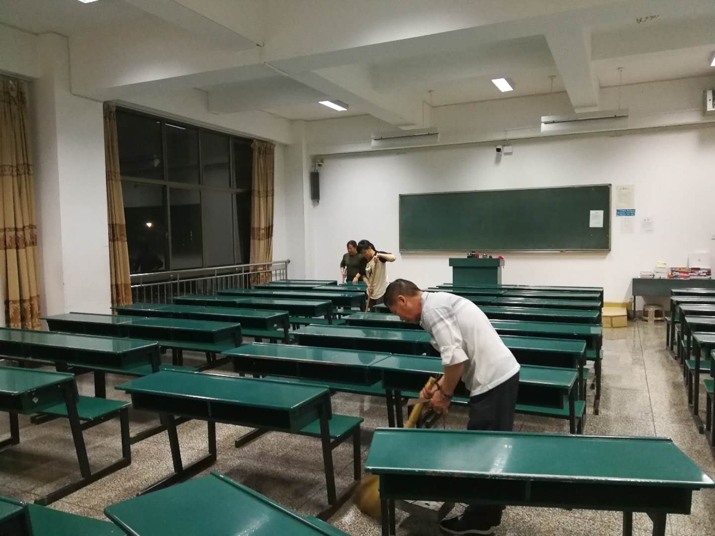 5月11日,物业服务中心东陆校区物业服务部接到教务处通知,及时组织员工对考场所在楼宇进行巡查,清点室内桌椅数量,配齐设备;认真检查水电供应情况,更换室内和过道受损灯具;全力做好卫生保洁工作,做到桌椅无灰尘、无纸屑,厕所无异味、无积水,卫生无死角。