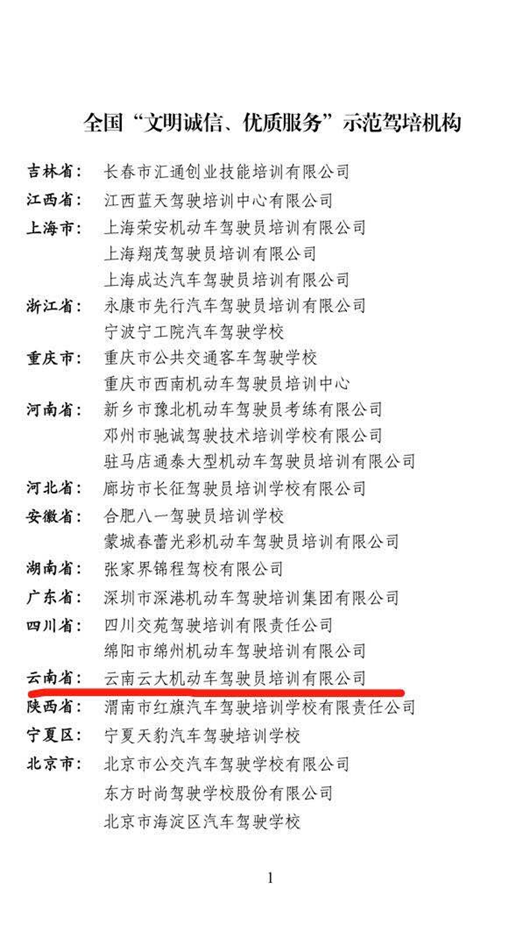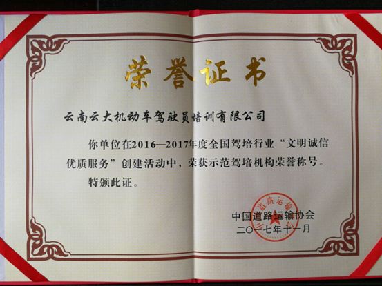 云大驾校荣获“全国‘文明诚信、优质服务’示范驾培机构”。