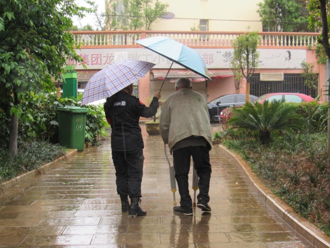 4月17日下午,家住云大龙泉小区3栋1单元201室的段老师因家中下水管道堵塞,手杵双拐,步履蹒跚,步入黉正物业客服窗口进行报修。当班职工搀扶段老师落座并联系维修部及时到现场排查疏通。天空突然飘起绵绵细雨,考虑到段老师行动不便,保安部安排专人陪护,送上最贴心的服务,让段老师感受到浓浓深情。