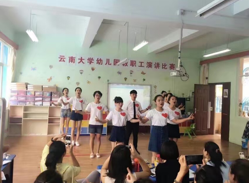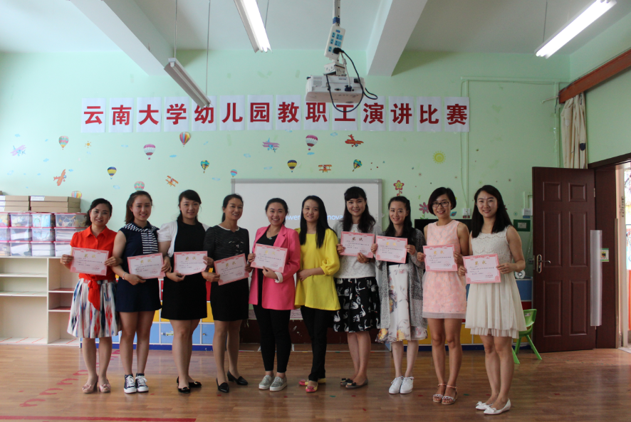 比赛当日,参赛职工个个精神饱满、容光焕发,或慷慨激昂,或娓娓道来,深情述说着自己在成长道路上追求幸福生活的勇气与智慧;在幼教热土上面对困境的从容与坚强;在与同事相处中的种种温暖瞬间……精彩的演说,真诚的内心读白,使在场的每位教职工深受感动和鼓舞。最终,宋燕、许路得老师脱颖而出,荣获一等奖。其它职工也表现不俗,分别获得二等奖和三等奖。更值得一提的是,我们平日里不善言辞的保育员、食堂人员也代表后勤组勇敢登上决赛讲台,尝试了自己人生中第一次走心的公开演讲。10位新教师虽无缘比赛,他们却用自己精心准备的节目,表达了他们对“爱”的理解,并迎得了全体教职工的阵阵掌声。大家在彼此的述说和聆听间感受着身为云南大学幼儿园教职工的骄傲和自豪,感受着身在这个大家庭的温暖,坚定了对幼教事业的热爱和执着。