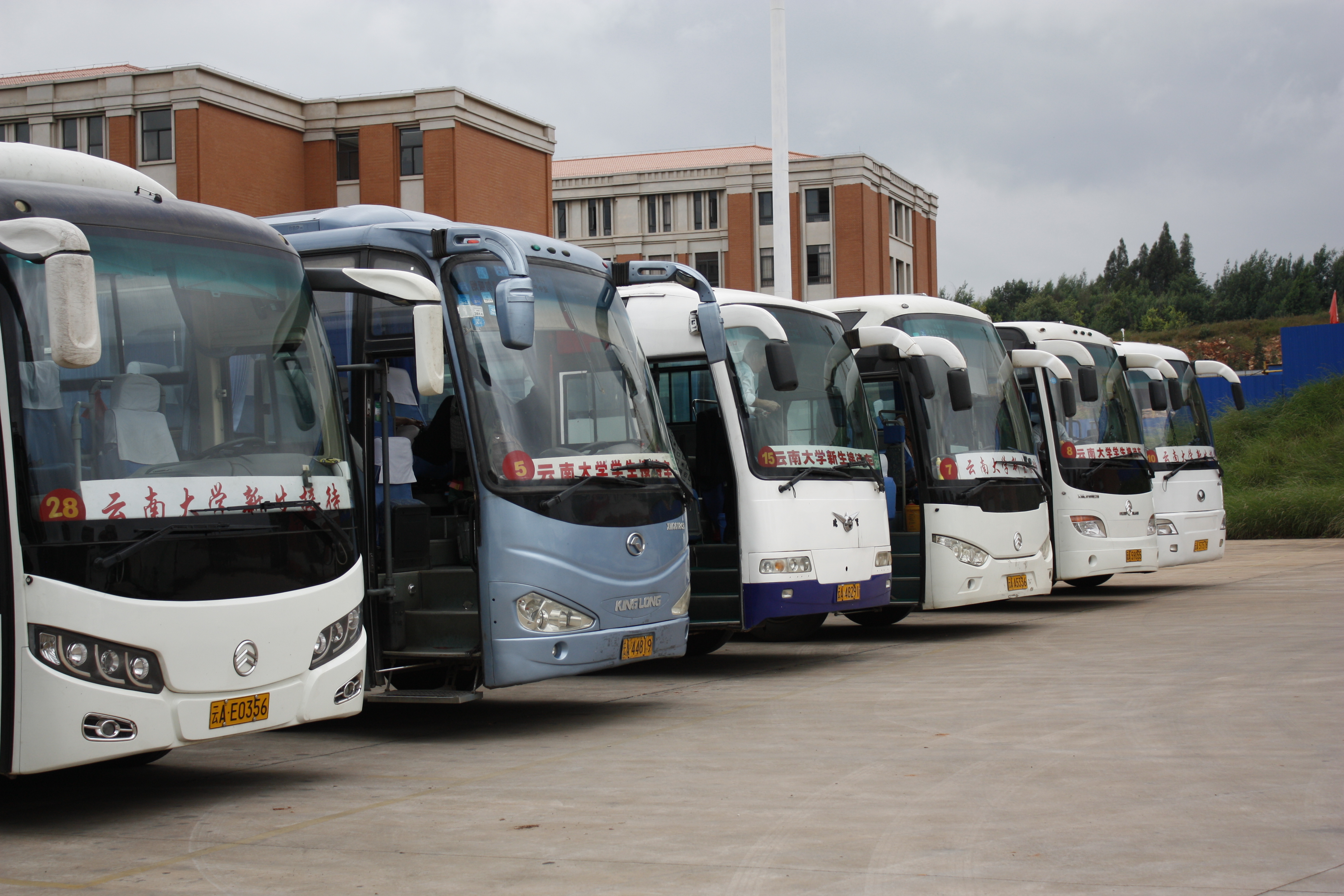 为方便新生及家长顺利抵达学校,交通车服务中心提前制定新生接站方案,在东陆校区停车场和呈贡校区北门安排车辆进行接站服务。本次迎新共投入大客车23辆,小车7辆,东陆校区至呈贡校区往返32车次,呈贡校区摆渡51车次,接送师生家长3000余人。新生接待当日,驾驶员从清晨6:00坚守至深夜10点,连续工作16个小时。有的师傅忙得顾不上喝水,来不及吃饭,他们却始终毫无怨言,坚守岗位。他们的热情服务和辛苦付出使初来乍到的新生和家长深切感受到了云大后勤人暖暖的温度。