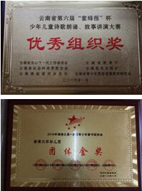 2016 年 2 月 3 日,幼儿园参加了由云南省教育厅、云南 省青少年思想道德教育研究会主办的云南省第六届“蜜蜂报” 杯少年儿童诗歌朗诵、故事讲演大赛。幼儿园荣获优秀组织 奖,顾海洁、肖若琳、尹欣老师荣获优秀指导教师奖,李梓卿、 尚窈羽和王楚涵小朋友荣获二等奖,何芊语小朋友荣获三等 奖。
