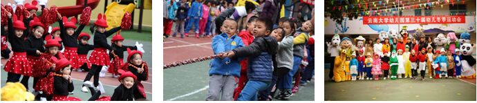 11月 25日,云大幼儿园迎来了第三十届幼儿冬季运动会。本届冬运会以“阳光校园 活力童年”为主题, 老师们装扮成孩子们最喜爱的卡通人物,孩子们身着白雪公主、叮当猫、小黄人等卡通服饰,师生共同协作, 为大家带来了妙趣横生、节奏明快的大型团体操表演。
