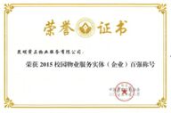 经专家委员会评审,共选出高校后勤实体 50 名、社会企业 50 名。 12 月 18 日,昆明黉正物业服务有限公司获得了“中国校园物业服务 实体(企业)百强”称号。