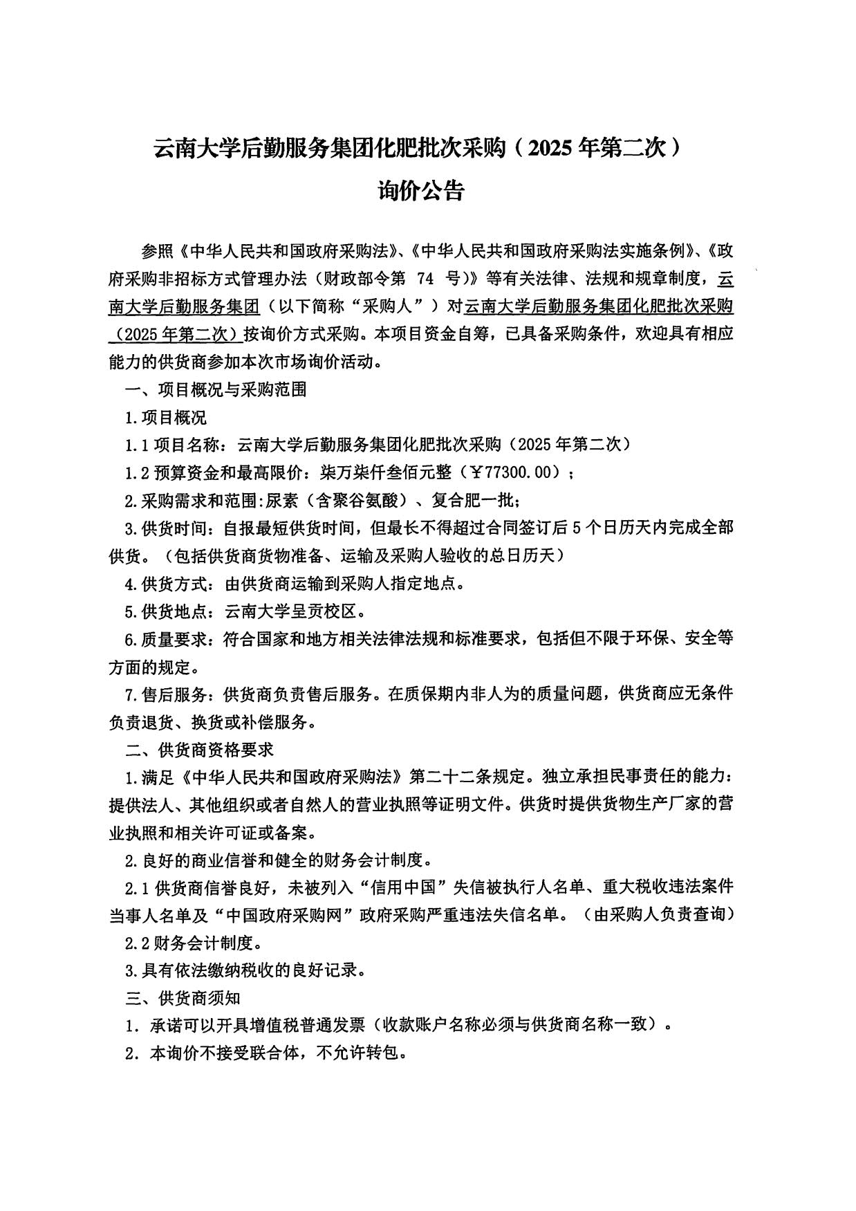 云南大学后勤服务集团化肥批次采购(2025年第二次)询价公告