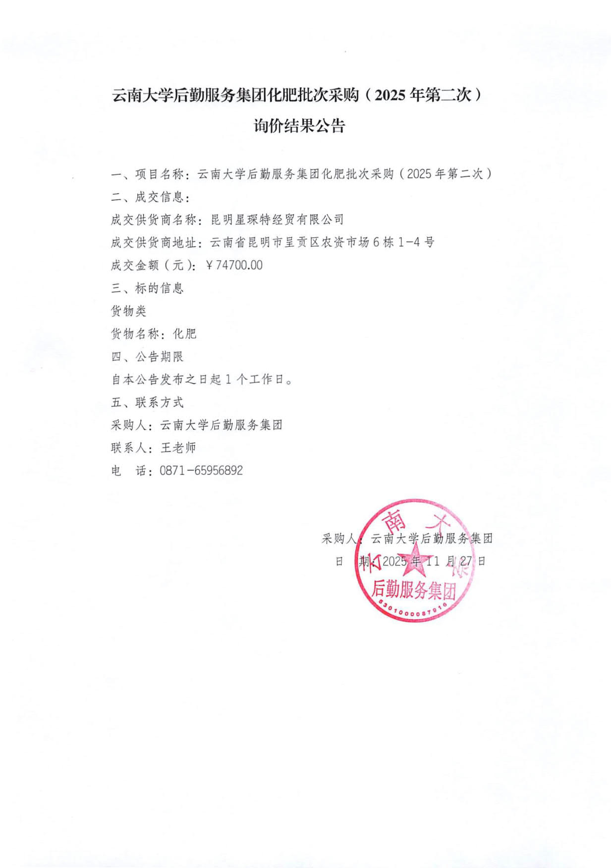云南大学后勤服务集团化肥批次采购(2025年第二次)询价结果公告
