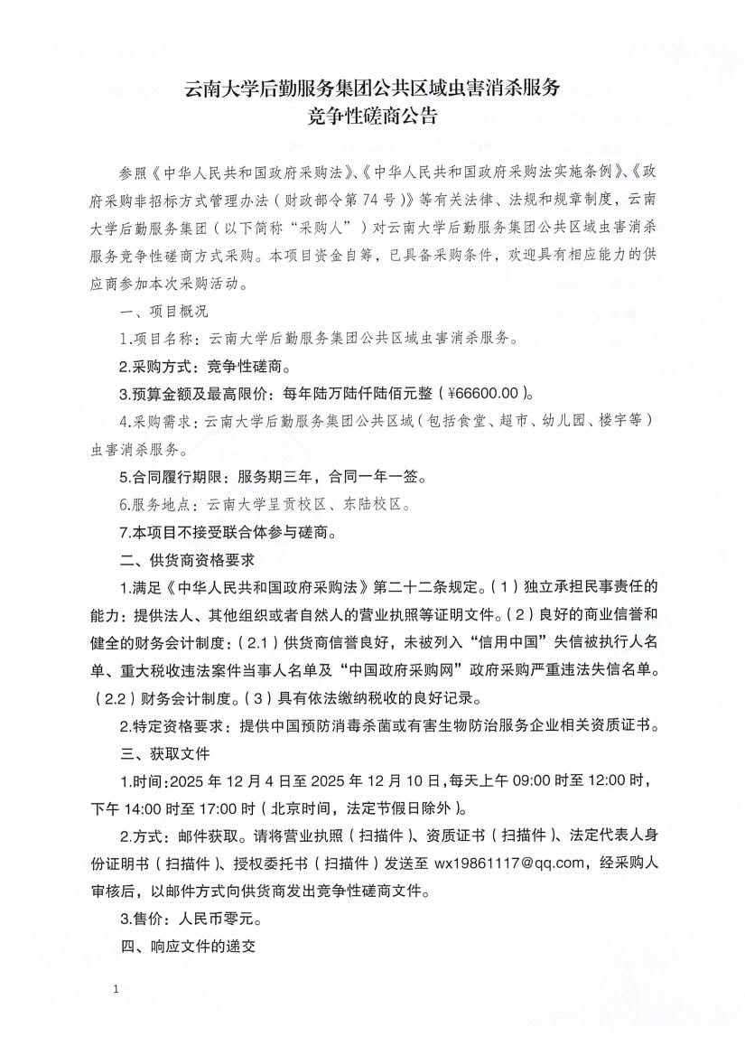 云南大学后勤服务集团公共区域虫害消杀服务竞争性磋商公告