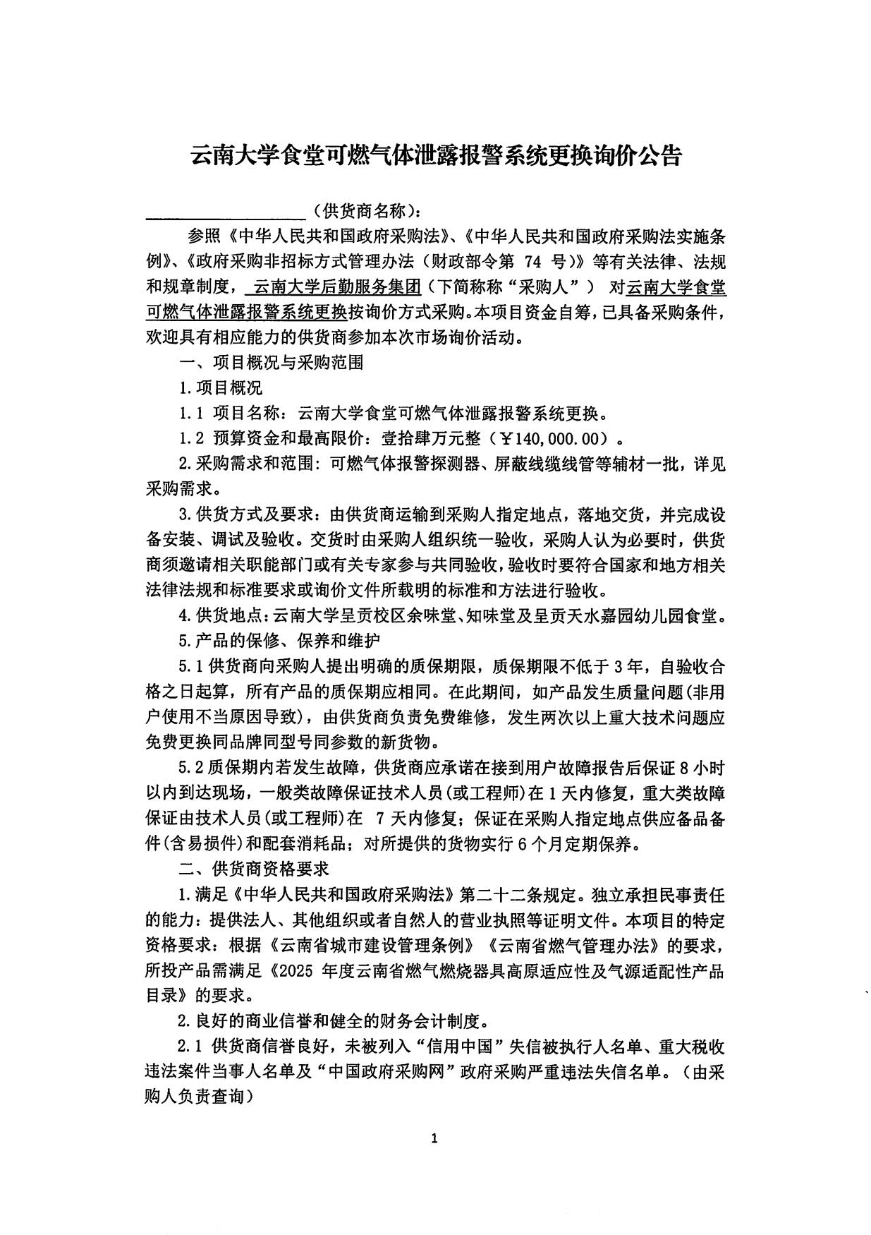 云南大学食堂可燃气体泄露报警系统更换询价公告