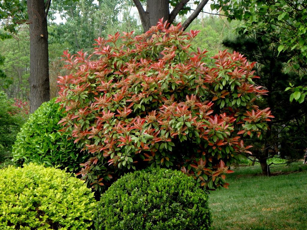 常绿灌木或小乔木,高度可达12M,株形紧凑。春季和秋季新叶亮红色。花期4-5月。梨果红色,能延续至冬季,果期10月。