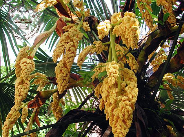 花序呈圆锥状,粗壮,长约1米,总梗上有6-7个佛焰苞,约6个分枝花序,长达35厘米,每分枝花序基部有1个佛焰苞,分枝花序具2次或3次分枝,小花枝长10-20厘米。花小,两性,长约2毫米;花萼裂至近基部成3个宽三角形近急尖的裂片,裂片有宽的干膜质的边缘;花冠约2倍长于花萼,裂至中部成3个半卵形急尖的裂片;雄蕊6枚,其基部合生成杯状并贴生于花冠基部,花丝稍粗,宽三角形,突变成短钻状的尖头,花药阔椭圆形;子房的心皮上面有深雕纹,花柱突变成钻状。