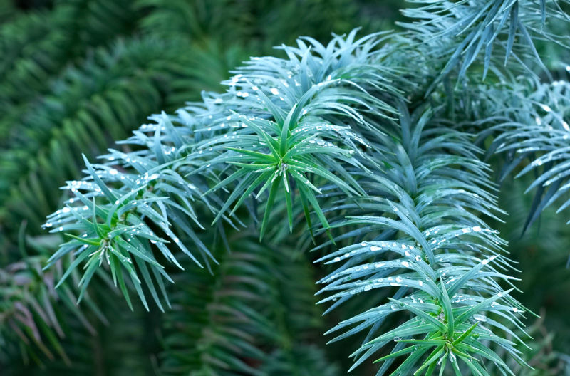 叶在主枝上辐射伸展,侧枝之叶基部扭转成二列状,披针形或条状披针形,通常微弯、呈镰状,革质、坚硬,长2~6cm,宽3~5mm,边缘有细缺齿,先端渐尖,稀微钝,上面深绿色,有光泽,除先端及基部外两侧有窄气孔带,微具白粉或白粉不明显,下面淡绿色,沿中脉两侧各有1条白粉气孔带;老树之叶通常较窄短、较厚,上面无气孔线。