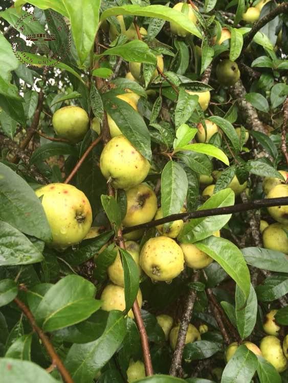 常绿乔木,高达3-10米,枝条稀疏;小枝粗壮,圆柱形,幼时密被黄白色绒毛,逐渐脱落,红褐色,老枝紫褐色;冬芽卵形,先端渐尖,鳞片外被柔毛。叶片披针形或卵状披针形,长6-8厘米,宽2-3厘米,先端急尖或渐尖,基部宽楔形或近圆形,全缘或稍有浅钝齿,上面无毛,深绿色,革质,有光泽,下面密被黄白色绒毛;叶柄长约1厘米,密被绒毛;托叶小,披针形,早落。花3-5朵,丛生于小枝顶端;花梗短粗,近于无毛,果期伸长,密被绒毛;苞片膜质,披针形,早落;花直径2.5-3厘米;萼筒钟状,外面密被黄白色绒毛;萼片披针形或三角披针形,长5-8毫米,先端渐尖或急尖,全缘,比萼筒稍短,内外两面均密被绒毛;花瓣宽卵形或长圆倒卵形,长12-15毫米,宽5-8毫米,基部有短爪,白色;雄蕊40-45,花丝长短不等,比花瓣短约三分之一;花柱5,基部合生并密被绒毛,与雄蕊近等长或稍短,柱头棒状。果实卵形或长圆形,直径2-3厘米,黄色,幼果密被绒毛,成熟后微被绒毛或近于无毛,通常有长果梗,外被绒毛;萼片宿存,直立或合拢。花期3-4月,果期5-6月。