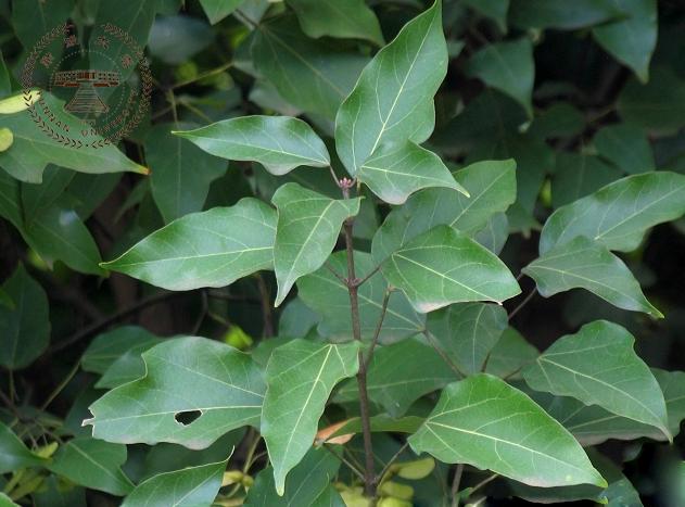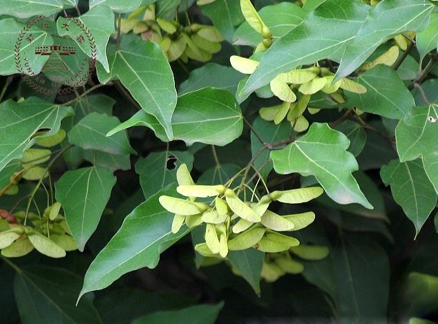 常绿乔木,常高5-10米,稀达15米。树皮褐色或深褐色,粗糙。小枝细瘦,无毛;当年生枝紫色或紫绿色;多年生枝灰绿色或褐色。冬芽椭圆形;鳞片淡褐色,边缘被纤毛。叶厚革质,基部阔楔形稀圆形,外貌近于长圆卵形、倒卵形或圆形,长7-11厘米,宽4-6厘米,全缘或3裂;中裂片三角形,先端钝尖或短渐尖;侧裂片短渐尖或钝尖,通常向前直伸比中央裂片略微短些,裂片边缘多系全缘,稀微呈浅波状;上面深绿色,无毛,平滑,有光泽;下面淡绿色,密被白粉;初生脉3条,在上面微现,在下面显著;侧脉5-7对,在上面微现,在下面常显著;叶柄长3-5厘米,紫绿色,无毛。花绿色,杂性,雄花与两性花同株,多数常成长3-4厘米的伞房花序,总花梗长2-3厘米;萼片5,黄绿色,无毛,披针形,长约4毫米;花瓣5,白色,线状披针形或线状倒披针形,长约6-8毫米,宽1毫米;雄蕊8,在雄花中通常约长8毫米,伸出花外,在两性花中非常短,花丝无毛,花药黄色,圆形;花盘无毛,微裂,位于子房外侧,子房初被白色绒毛,花开后毛陆续脱落,在雄花中不发育,仅在花盘中间有毛一丛,花柱长2毫米,无毛,2裂,柱头平展或微反卷;花梗长2厘米,细瘦,无毛。翅果嫩时黄绿色或绿褐色;小坚果特别凸起,卵圆形,长8 毫米,直径6毫米;翅长圆形,与小坚果共长3 厘米,宽1.2-1.4厘米,张开成钝角,稀成水平。花期3月,果期8月。