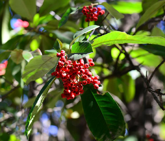 其叶片翠绿色,具光泽,早春幼枝嫩叶为紫红色,枝叶浓密,老叶经过秋季后部分出现赤红色,夏季密生白色花朵,秋后鲜红果实缀满枝头,鲜艳夺目,是一个观赏价值极高的常绿阔叶乔木,作为庭荫树或进行绿篱栽植效果更佳。根据园林绿化布局需要,可修剪成球形或圆锥形等不同的造型。在园林中孤植或基础栽植均可,丛栽使其形成低矮的灌木丛,可与金叶女贞、红叶小檗、扶芳藤、俏黄芦等组成美丽的图案,获得赏心悦目的效果。