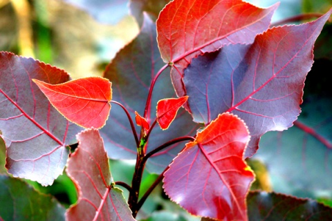 中华红叶杨叶片颜色春、夏、秋三季四变。从发芽到6月中旬为紫红色,6月中旬到7月中旬紫绿色,7月中旬到10月上旬是褐绿色,10月中旬以后逐渐变为黄色或桔黄色,但叶柄、叶脉、树干顶端和侧枝顶端在整个生长期间始终是红色。叶片稠密、大而肥厚,有光泽,主干顶端和侧枝顶端的叶片始终如同一朵朵盛开的鲜花,亮丽夺目。