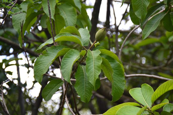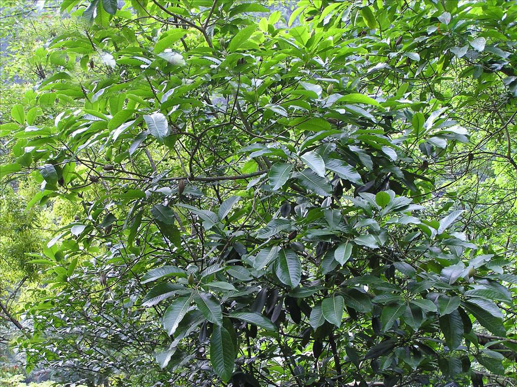 落叶乔木,树皮灰色或浅灰色,光滑;幼枝淡灰色,皮孔明显,当年生枝有疏毛,老枝无毛。叶大型,薄革质,椭圆形或卵状长圆形或长圆状倒卵形,蒴果大,椭圆形,密被橙黄色绒毛,后变无毛,外果皮革质,内果皮为木质,中部联合,种子多数,生于海拔500-1400米之间的阔叶林中。