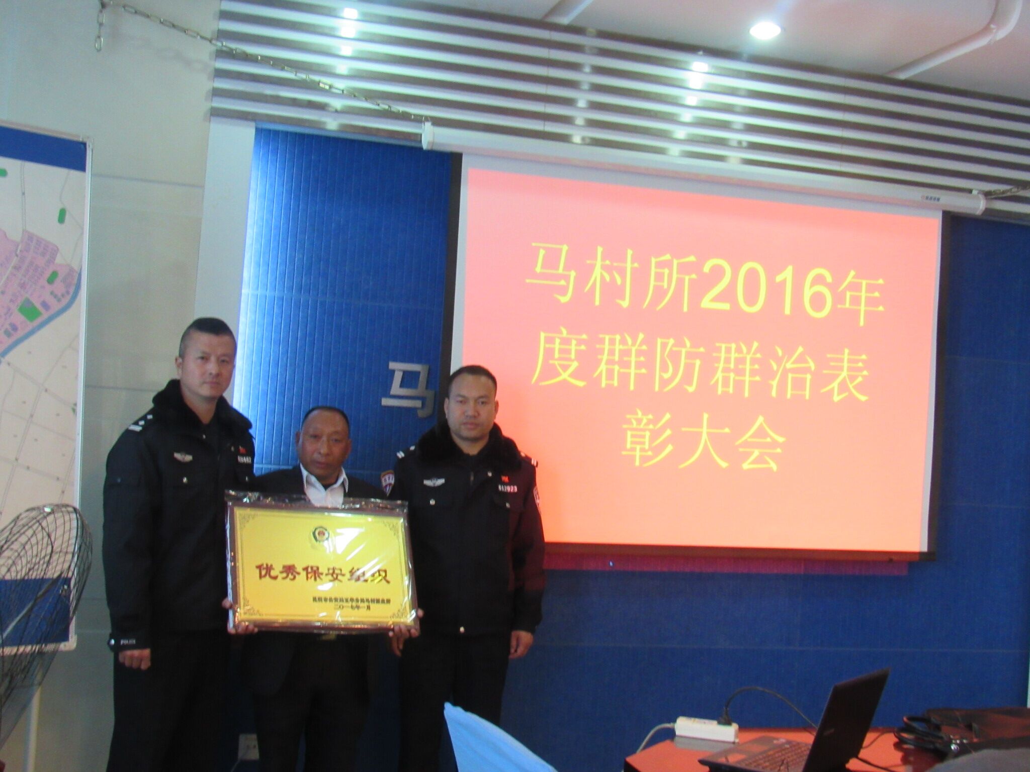 1月22日,马村派出所组织召开了“2016年度社会治安群防群治表彰大会”。会上,市公安局五华分局马村派出所赵志平副所长宣读了2016年“优秀保安组织”的表彰决定。黉正公司获得优秀“保安组织”荣誉称号,罗星查副经理获得“治安防控先进个人”荣誉称号。